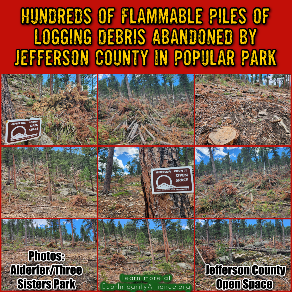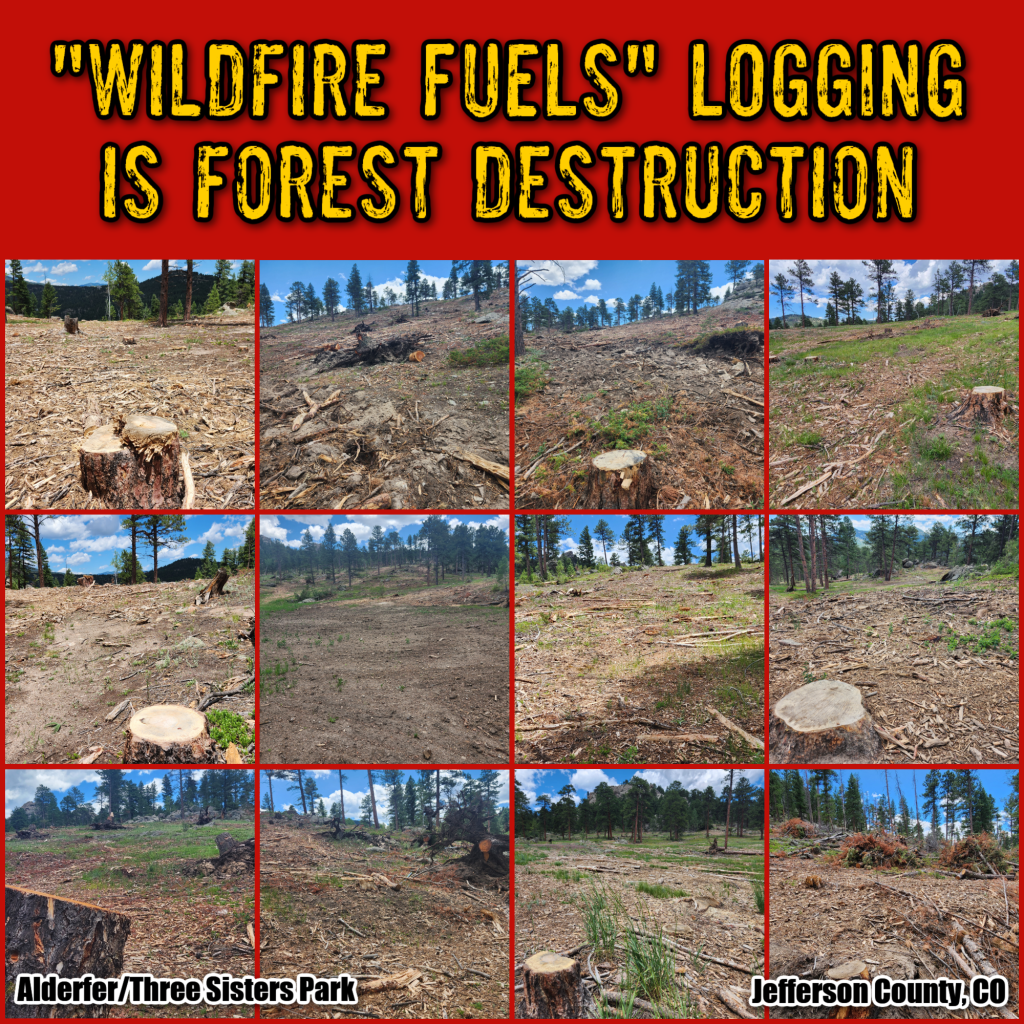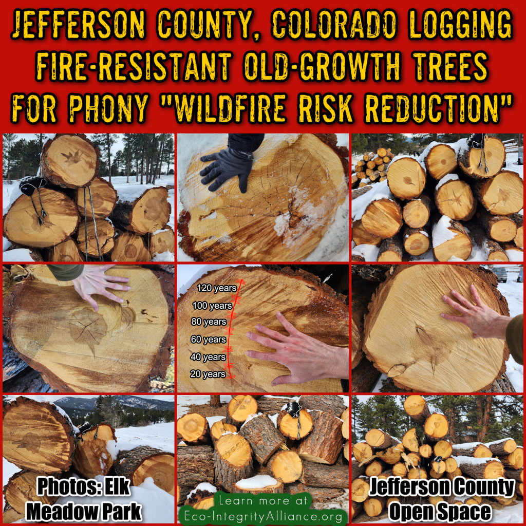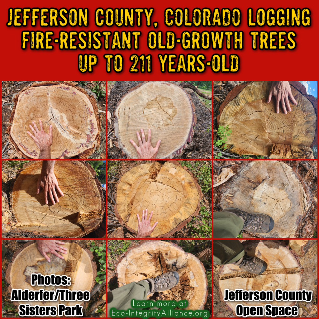 Despite overwhelmingly negative public feedback, Jefferson County Open Space is in the final stages of logging hundreds of acres of Alderfer/Three Sisters Park in Evergreen, Colorado—including fire-resistant old-growth ponderosa pine trees up to 211 years old—under the justification of “wildfire fuels,” ignoring an entire body of peer-reviewed scientific studies disputing claims of such “thinning” protecting communities.