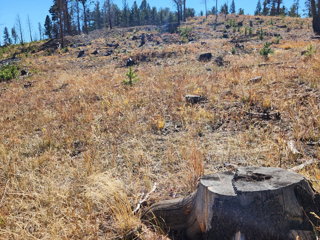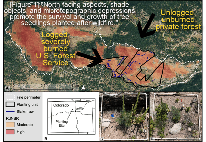 Videos and photos taken in October within the Cold Springs Fire area in the Boulder Ranger District of Roosevelt National Forest show a sparsely treed landscape with blackened stumps directly behind a U.S. Forest Service sign, which, despite Forest Service replanting in 2018, has still not recovered. Meanwhile, the adjacent unlogged forest on private land, remains lush, green, and completely intact.