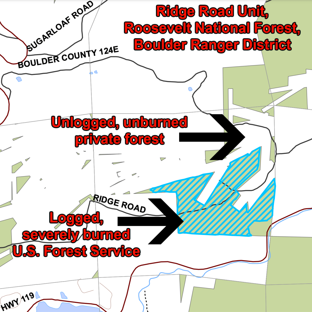 Evidence in a study funded by U.S. Forest Service, and co-authored by Colorado Forest Restoration Institute and the Colorado Field Office for The Nature Conservancy, shows that 122 acres of public forest outside Nederland “thinned” in 2015 in the name of “wildfire fuel reduction” burned at “high severity” during the 2016 Cold Springs Fire, destroying five homes, while the unlogged forest feet away didn’t burn at all.