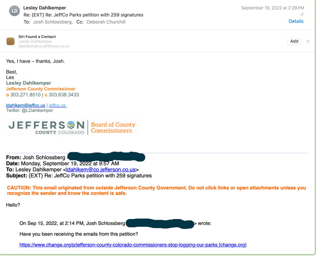 On September 15, 2022, plaintiff Josh Schlossberg (formerly a Jefferson County resident, now living in Boulder County) sent an email to Commissioner Dahlkemper asking if she was receiving emails from a Change.org petition opposing logging in Jefferson County Open Space addressed to her and other Commissioners. On September 19, Dahlkemper replied that she had.